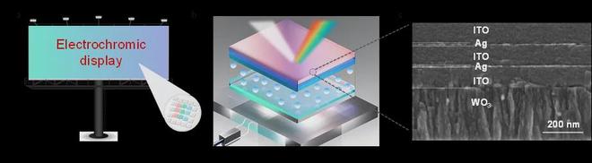 图1. DMD全固态ECDs。(a)基于DMD全固态电致变色器件子像素的电致变色像素显示器,适用于未来的广告牌。(b)电致变色像素显示器的结构(由电极、电致变色像素和外部电路组成)。(c)DMD电极材料的放大结构。